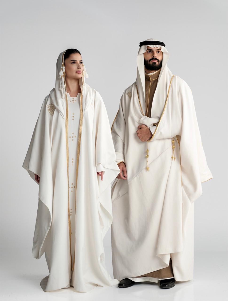 For the women's look, I went back to the Thoub Al Musaddah. It’s one of our most iconic traditional pieces, specifically known for those distinct dotted patterns and that deep, striking blue. It’s got such a recognizable character, and I wanted to use that as the foundation to show how our heritage can feel completely modern. I designed it in a modern way with a head covering connected to the garment from top to bottom and decorated with “Bairam” fringes. I handmade it with my mother under the supervision of my respected teacher Fatimah Al Talhi. The white color was chosen according to the protocol of wearing the bisht in the Kingdom of Saudi Arabia on Friday, as each day of the week has its own specific color.