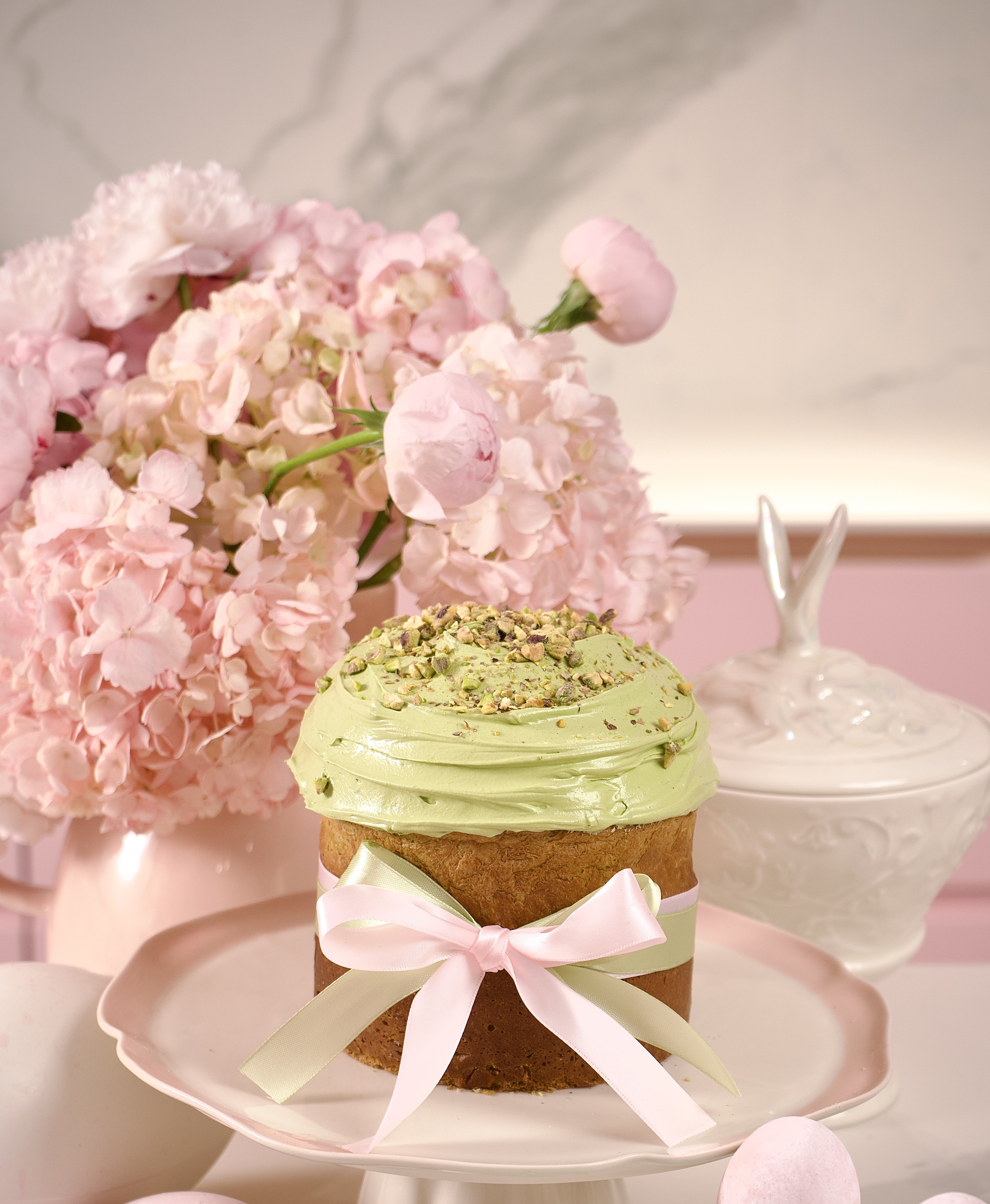 Their pistachio Easter cake is built around texture — soft, airy dough layered with pistachio paste and centred with a rich, creamy ganache. It’s finished with signature icing and a generous crunch of pistachios on top.
